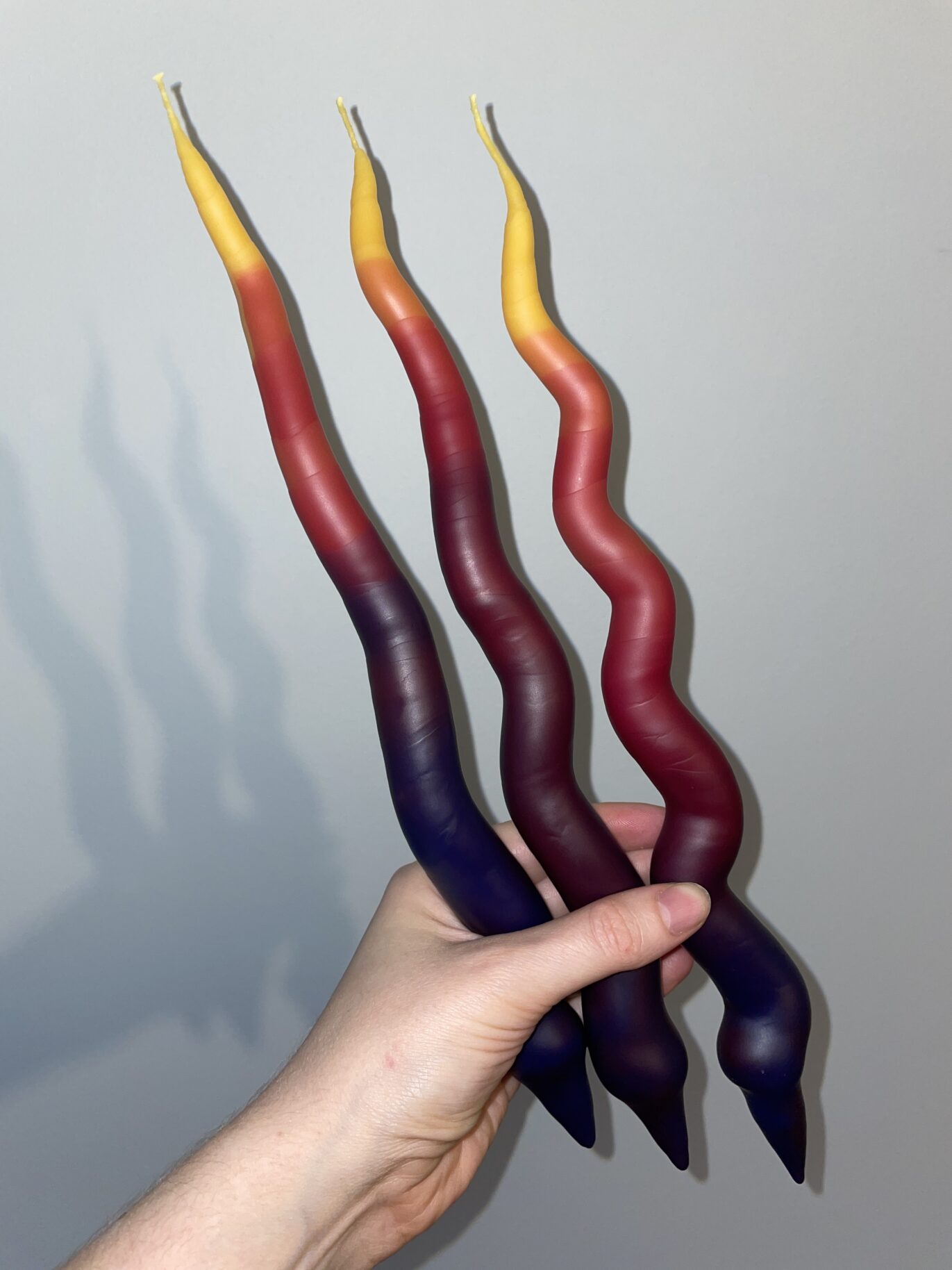 Each piece is an original, made by hand dipping in dyed bleached beeswax.