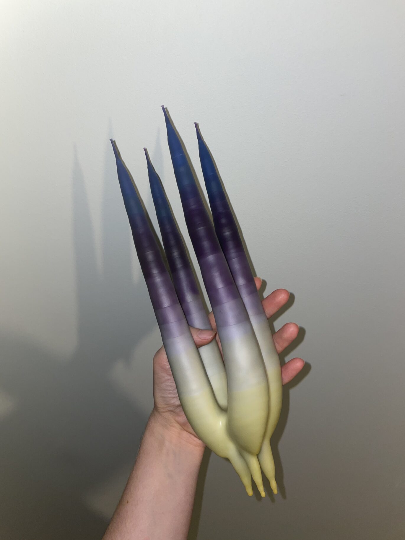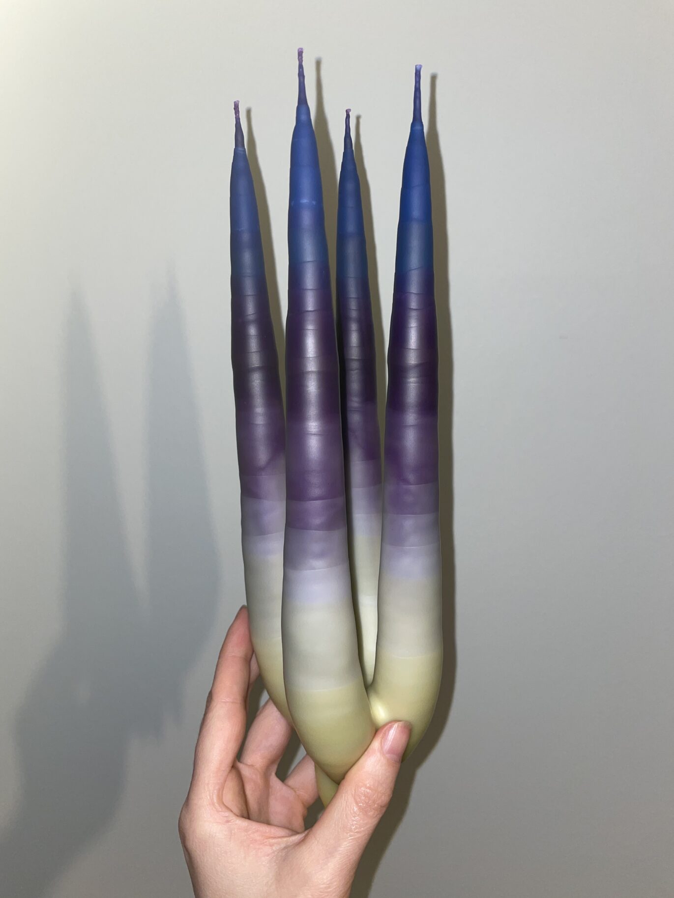 Each piece is an original, made by hand dipping in dyed bleached beeswax.
