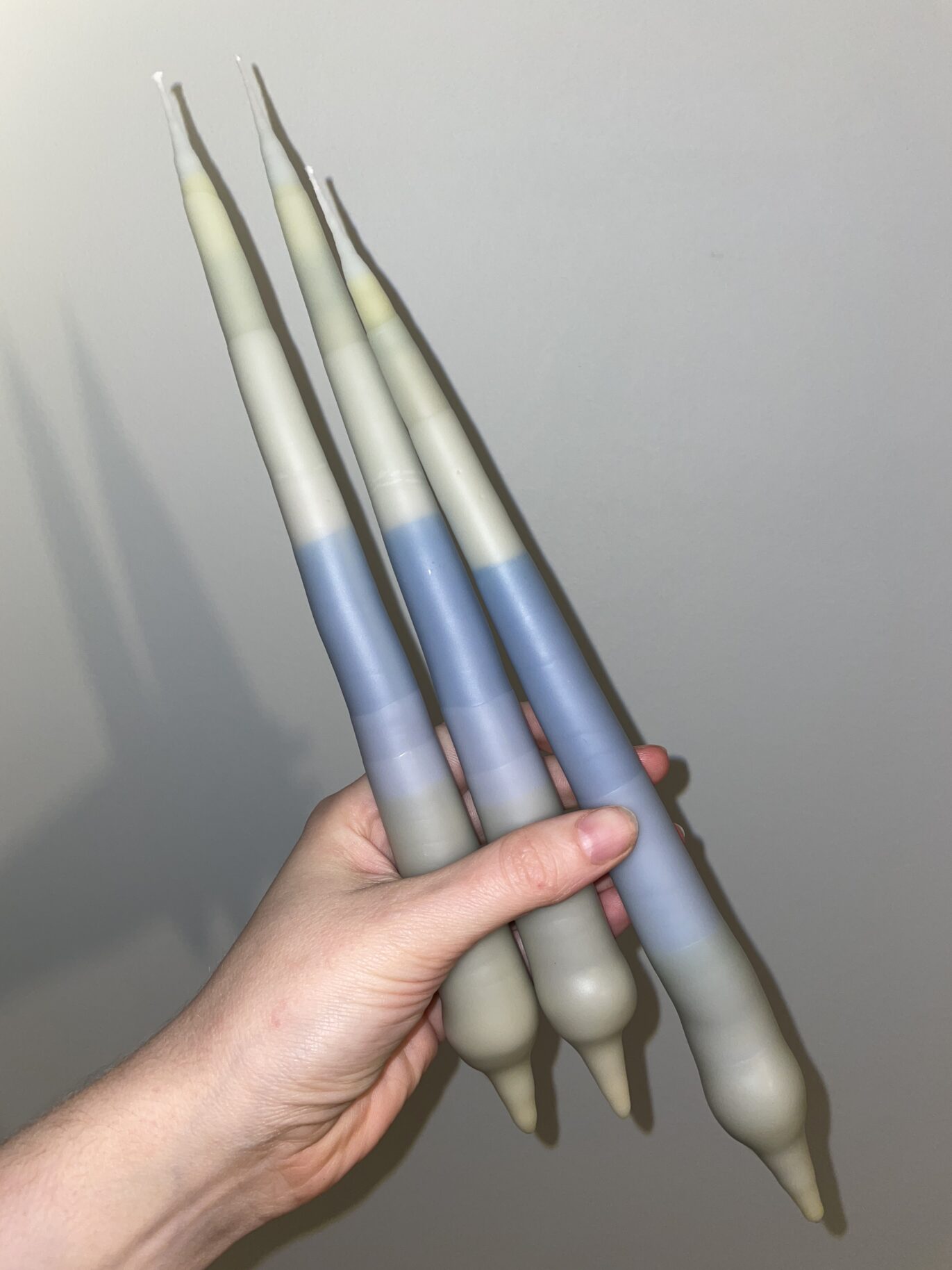 Each piece is an original, made by hand dipping in dyed bleached beeswax.
