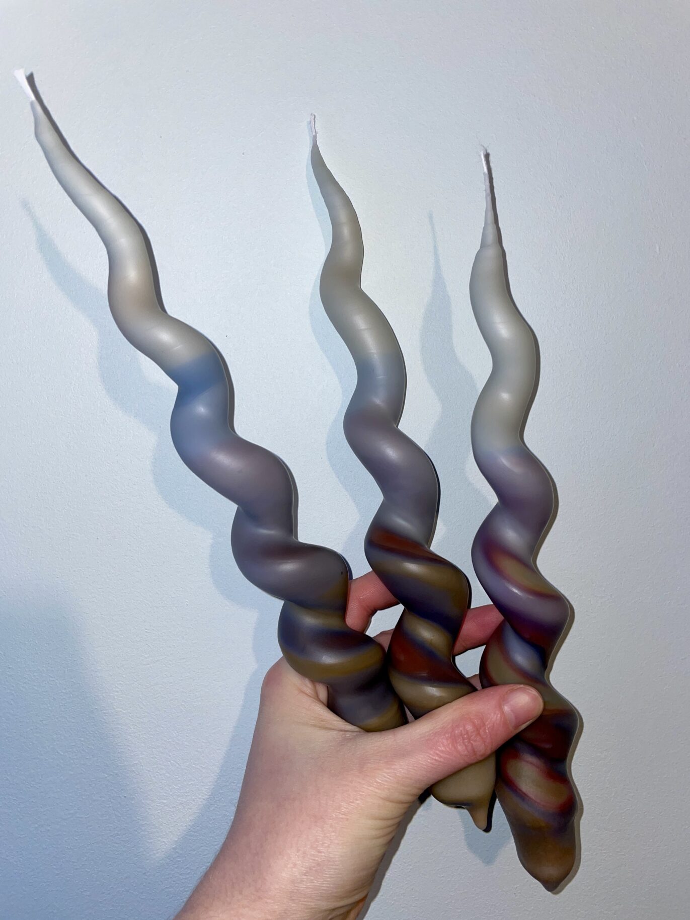 Each piece is an original, made by hand dipping in dyed bleached beeswax.