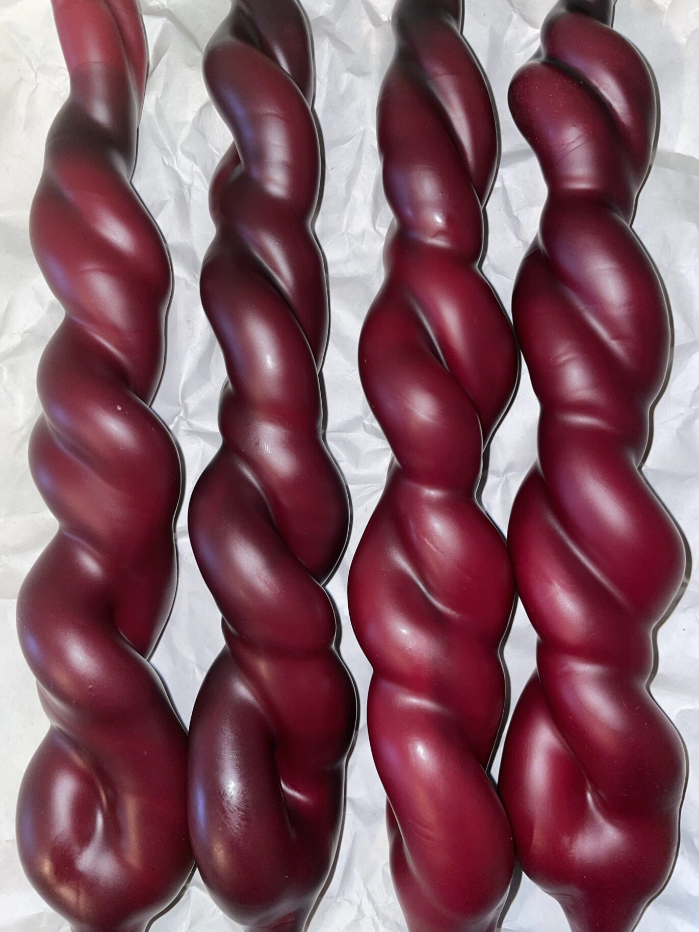 Each piece is an original, made by hand dipping in dyed bleached beeswax.